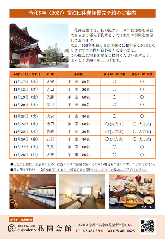 花園会館では、秋の観光シーズンに団参を誘致できるよう優先予約枠として洋室のお部屋を確保しております。